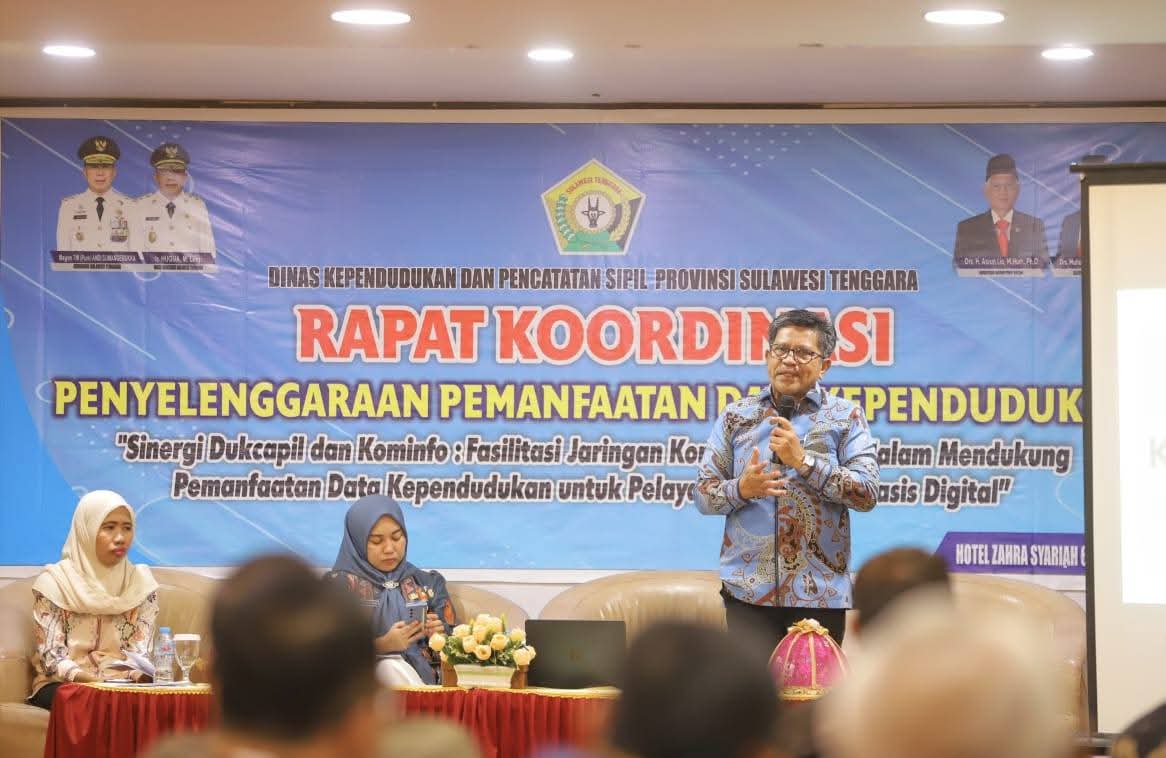 KENDARI – Kepala Dinas Komunikasi dan Informatika (Kominfo) Provinsi Sulawesi Tenggara, Dr. M. Ridwan Badallah, S.Pd., MM., menjadi narasumber dalam Rapat Koordinasi Penyelenggaraan Pemanfaatan Data Kependudukan yang digelar di Hotel Zahra Syariah, Kendari, Kamis (7/8/2025).
